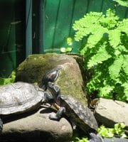 We have a new filter system in the turtle pond and a little waterfall. Hopefully this will improve water quality and clarity and reduce maintenance. We now have 5 turtles and a bunch of fast growing goldfish. The turtles are still shy. Four of them spent the winter in the aquarium indoors and are still shy unless there’s full sun.