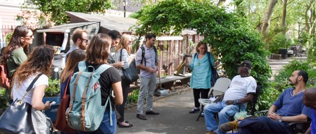 Tourism professionals from the Travel + Social Good Summit held at the United Nations in May take part in the Hola LES tour led by coalition member Wendy Brawer of Green Map. They enjoyed meeting Bob Humber and loved the garden!