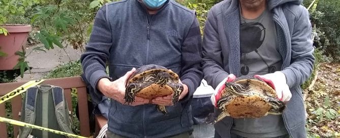 Every fall, when the temperature drops into the 50s, we pump down the pond, move the fish temporarily into bins, and net out the turtles. [...]