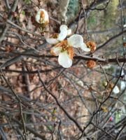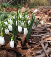“Hellebores in Valerie’s plot, then Japanese flowering quince in Elizabeth’s, Witch hazel (Mary Forster) and snow drops …”